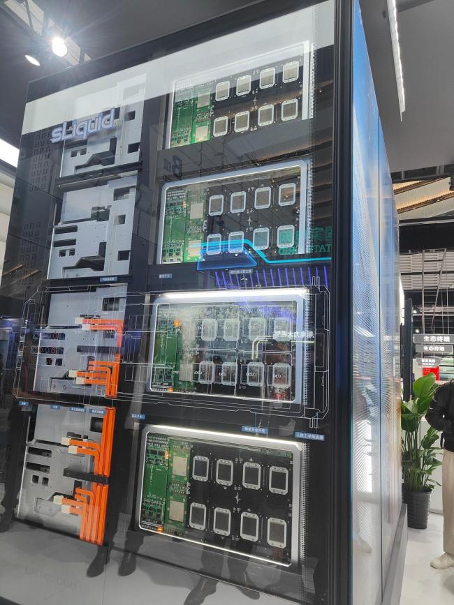 随着AI应用扩大,算力基础设施如何支撑成为焦点。超节点在年内的科技行业盛会上频繁亮相。华为展出一整面昇腾384超节点的“墙”,壁仞科技、新华三等也入局超节点。中科曙光则在乌镇峰会上发布了单机柜级640卡超节点,展馆中一台黑色机器内部咕噜咕噜冒着水泡,这是机柜内的浸没相变液冷系统。