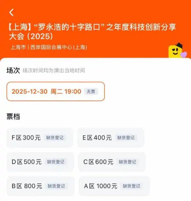 12月22日午间,“罗永浩的十字路口”年度科技创新分享大会门票正式开售,票价分为300元、400元、500元、600元、800元、1000元六档,不支持退票、实名制购票和入场、不支持选座。门票开售后不久便被抢光,低价票几分钟内就显示“缺货登记”,约两小时后所有价位门票均已售罄。